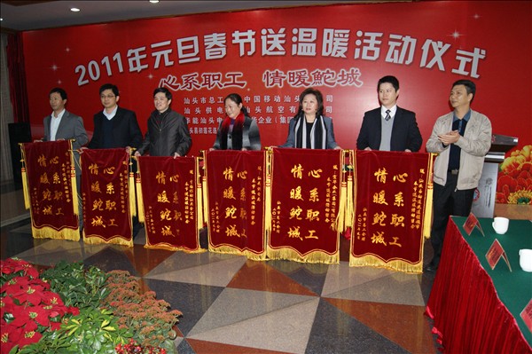 2011年1月10日下午,百瑞彩票联合爱心企业在汕头宾馆二楼会议厅举行以“心系职工·情暖鱼它城”为主题的元旦春节送温暖活动仪式。市委常委、宣传部部长陈茸,市人大常委会副主任、市总工会主席刘远珍,市总工会党组书记高耿浩,副主席周波,副调研员吴爱华出席活动仪式。基层工会代表、出资单位代表、困难职工代表共180多人参加了会议。