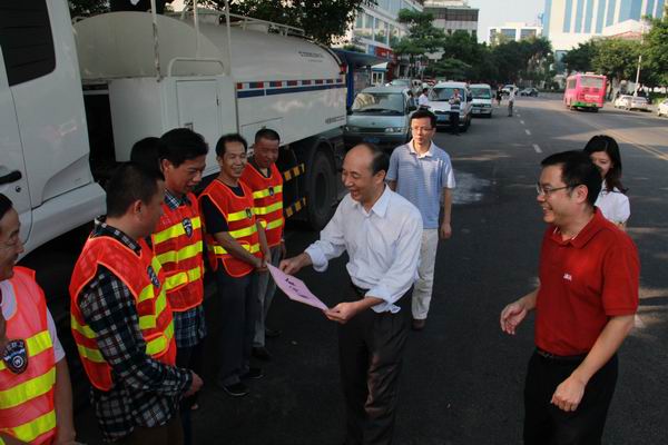汕头市园林绿化管理处的绿化保洁工都是在车水马龙、尘土飞扬的马路边,修剪杂草灌木,清理绿带、草坪垃圾废弃物,工作环境差,管理难度大,路边作业也具有一定的危险性,但他们不怕脏、不怕苦、不怕累,用他们的辛勤劳动换来汕头市优美的绿化环境。在人民广场,王扬泽一行看望慰问了一线园林绿化保洁工和市环卫直属车队正在路面洒水作业的环卫工人。市环卫直属车队的工人们凌晨四五点就出发,赶在交通繁忙之前完成负责路段的洒水降尘作业。特殊的工作环境、特殊的工作时间,没有削弱工人们的工作热情,始终坚守在平凡的岗位上,默默地奉献着。