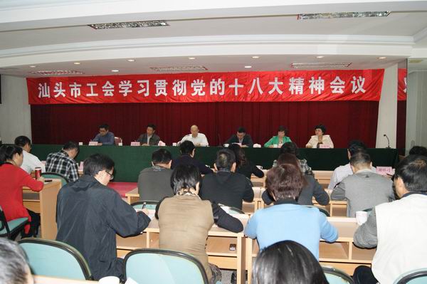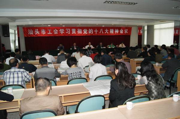 11月20日下午,百瑞彩票召开汕头市工会学习贯彻党的十八大精神会议。市总工会总领导班子成员、各区(县)总工会领导班子成员,市总机关全体工作人员及市总直属各单位领导班子70多人参加了会议。