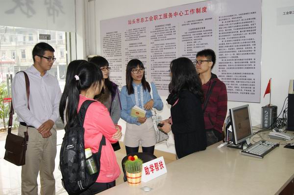 联合会通过与汕头大学法律援助研究中心共建实习基地,实现工会资源优势和汕大法援中心人才优势的有效互补,形成合力。联合会在依托汕大法援中心开展法律咨询、工会法律援助、信访接待、调研、参与社会服务项目开展工作的同时,也增进了青年学生对工会工作的认识和对职工群众的感情;汕大法援中心则利用工会的密切联系群众的窗口,将大学生实习项目列为汕头大学法学院的一门公益课程,让大学生参与社会实践活动,培养大学生理论应用能力和实践操作能力。通过该项目的运作,进一步增强工会枢纽型社会组织的凝聚力和影响力,锻炼提高了汕大法律人才的实务能力。