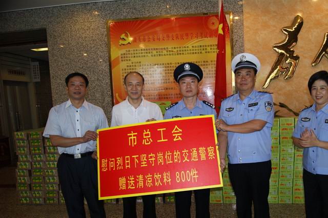 为贯彻中央关于开展党的群众路线教育实践活动的要求,7月23日,市人大常委会副主任、市总工会王扬泽主席,市总工会副主席王述宗带领工作人员,为炎炎夏热工作在一线的市公安局交警支队干警和华能广东海门港务公司职工送去清凉。
