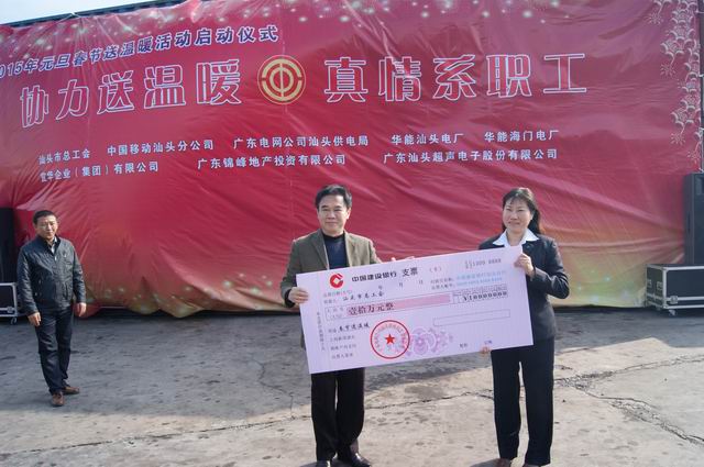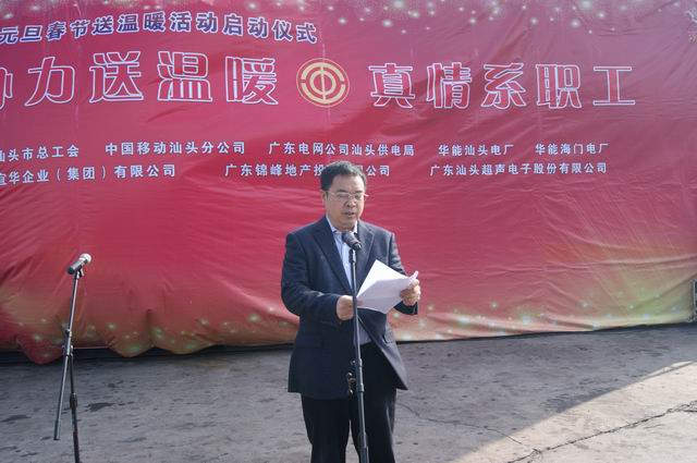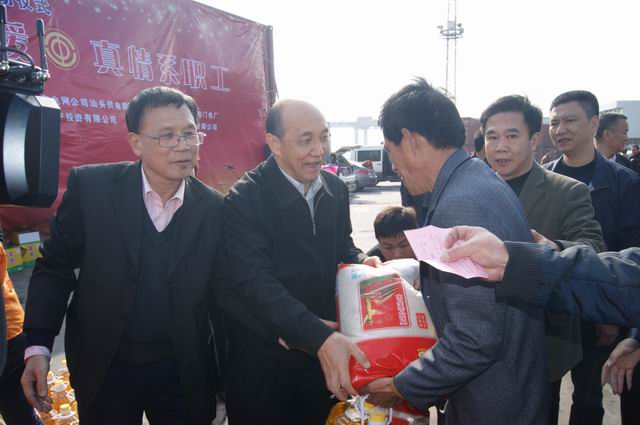 1月28日,百瑞彩票联合广东电网公司汕头供电局、中国移动汕头分公司、华能汕头电厂、华能海门电厂、超声电子集团公司、宜华集团公司、市慈善总会、广东锦峰地产投资有限公司等热心企在西堤港务公司举行以“协力送温暖、真情系职工”为主题的2015年元旦春节送温暖活动启动仪式。市委副书记孙光辉,市人大常委会副主任、市总工会主席王扬泽、市委副秘书长张锡潮等领导出席启动仪式,市总工会党组书记、副主席高耿浩主持了仪式,来自各基层工会干部代表、困难职工代表三百多人参加本次送温暖活动启动仪式。仪式结束后,市领导还上门慰问和看望特困职工及困难劳模,为他们送去关爱。