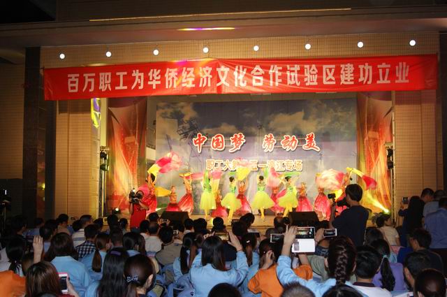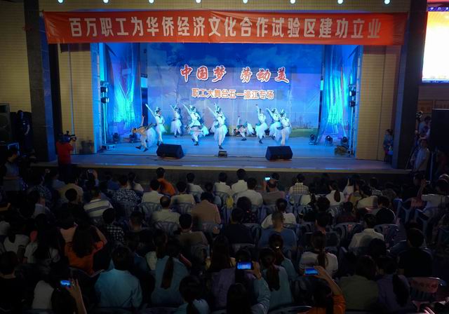 4月28日,汕头市濠江区滨海街道钱塘居委文化广场人头攒动、掌声不断,市总工会举办的“中国梦 劳动美”汕头职工大舞台五一专场演出在这里华丽上演,许多群众扶老携幼前来欣赏。舞蹈、女声独唱、杂技、现代舞、小品、武术、器乐合奏……来自我市艺术团体以及企事业单位的演员用精彩丰富的文艺形式展示了汕头职工的精神风貌。市人大常委会副主任、市总工会主席王扬泽等出席并观看演出。
