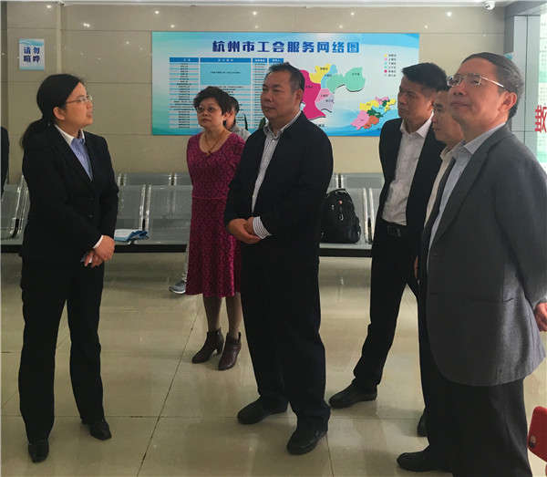 陈向光同志一行先到杭州市职工服务中心,详细了解杭州市职工服务中心的定位、职能、服务特色和服务创新项目等工作。随后,到杭州市总工会进行座谈交流,会上,杭州市总工会翁正营同志介绍了本市工会近期工作与特色工作。