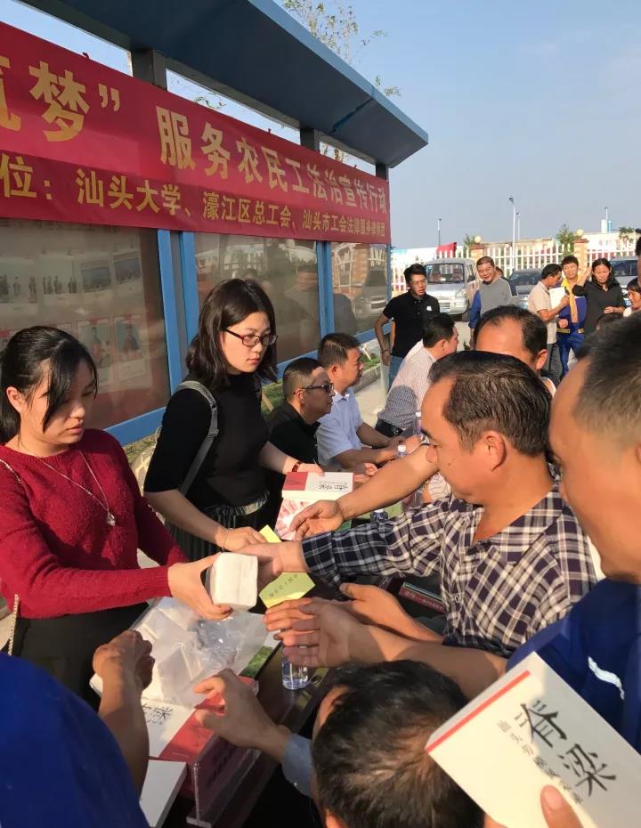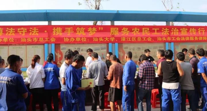 为进一步做好新时代农民工服务工作,加强对农民工的法治宣传教育,维护好农民工的合法权益,真正做好广大职工的“娘家人”,由市总工会、濠江区总工会、市工会法律服务律师团、汕头大学举行的“遵法守法·携手筑梦”服务农民工法治宣传活动于11月15日下午来到濠江区滨海片区市重点项目工程海湾通道南岸工地,为该片区在建工程工地的300多名建筑工地外来务工人员提供法律宣传和咨询服务。
