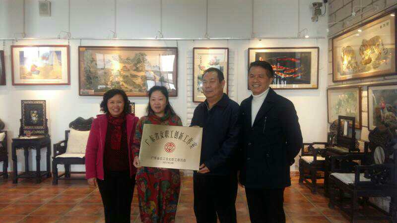 在汕头市裕虹抽纱刺绣研究院,陈向光向国家级非物质文化遗产潮绣传承人——洪裕静颁授了“广东省女职工创新工作室”的牌匾,洪裕静向调研组介绍了该女职工创新工作室的定位、成员组成,工作目标和职责等情况。陈向光充分肯定洪裕静在宣传、传承、振兴潮汕刺绣做出的贡献,并希望工作室发挥名师引领作用,继续在更大的平台上展示女职工的风采,传承潮汕优秀传统文化。