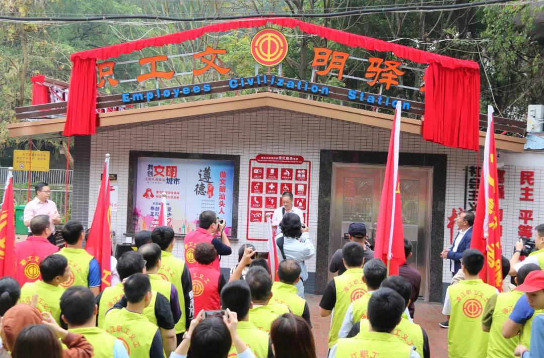 仪式现场,市人大常委会副主任、市总工会党组书记、主席陈向光和濠江区领导连泽生为职工文明驿站揭牌,并祝贺驿站顺利建成启用。职工户外小憩站由市总工会领导陈菲和濠江区领导蔡南共同揭牌,这标志着汕头市首个由职工义工志愿者组织运行,面向全市职工群众服务的职工文明驿站和职工户外小憩站正式启用。