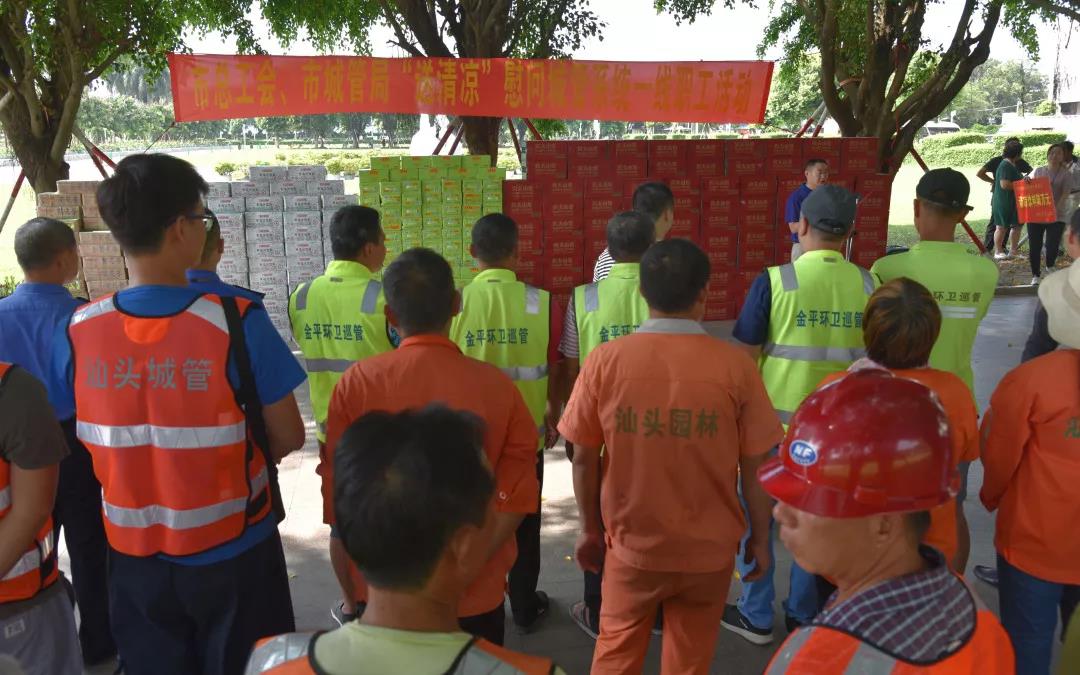 8日、9日市总工会慰问组还将给战斗在市政交通重点项目建筑工地的汕湛高速公路汕头段工地、中建五局汕北大道、中建二局泰盛科创园、牛田洋快速通道濠江段的一线建筑工人和顺丰快递、金特加油站以及章盛卫生保洁公司的一线职工送去清凉。