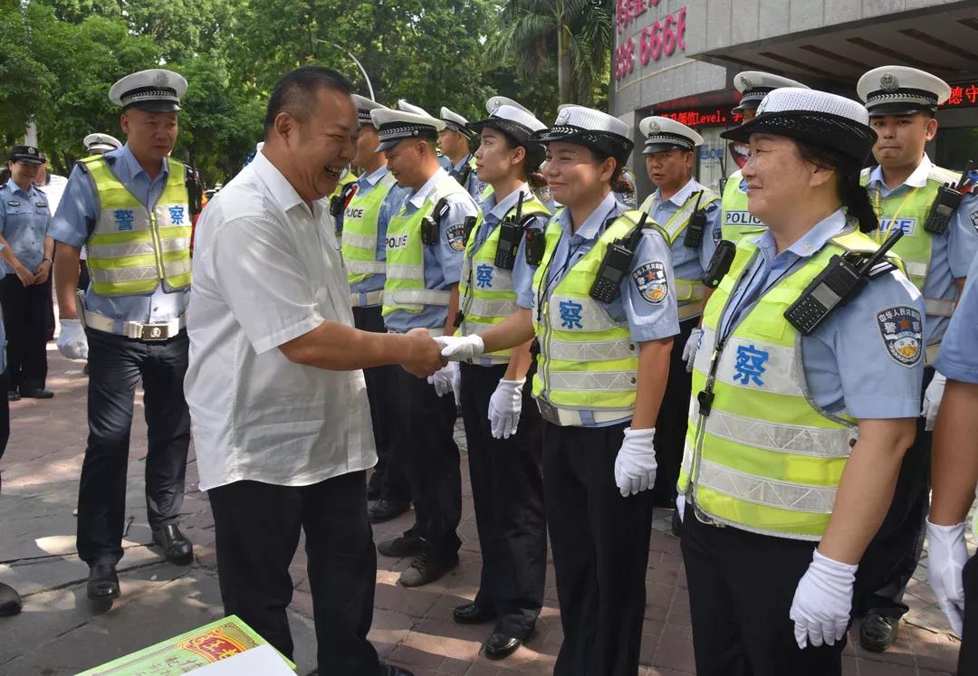 随后,慰问组来到金砂天山交界路口,向一线执勤交警送去降温解暑慰问品。陈向光与执勤交警握手交谈,了解路段交通安全状况,并表示:“交巡警顶烈日、战酷暑,坚守在工作一线,大家非常辛苦。希望大家继续保持昂扬的斗志,科学安排勤务,文明规范执法,在坚守岗位的同时要做好防暑工作,要确保自身安全。”